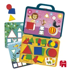 - Inhoud: 1 koffertje – 15 zelfcorrigerende geïllustreerde sjabloonvellen – 55 vormpjes in verschillende vormen en kleuren.