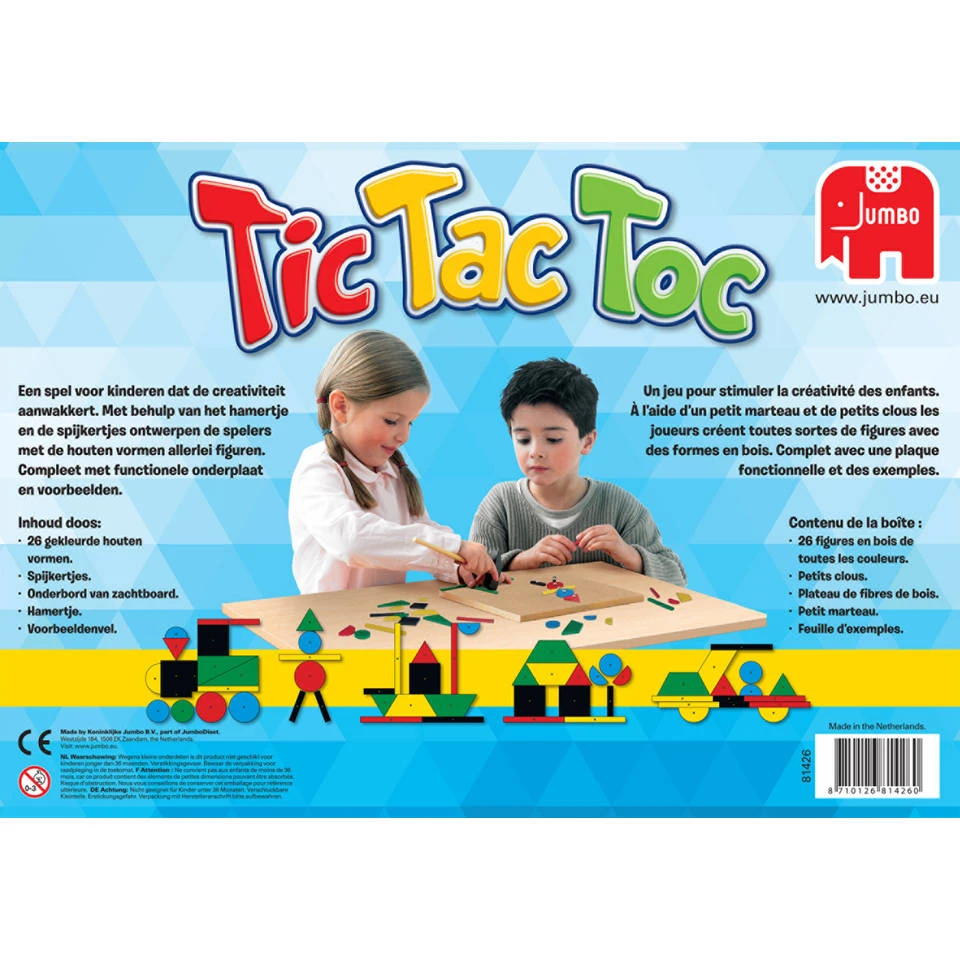 Tic Tac Toc. Een spel voor kinderen dat de creativiteit aanwakkert. Met behulp van het hamertje en de spijkertjes ontwerpen de spelers met de houten vormen allerlei figuren.