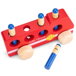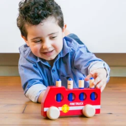 Kinderen kunnen fijn spelen met deze New Classic Toys houten pop-up brandweerauto. Druk op de brandweerpoppetjes en zie hoe ze in actie komen.
