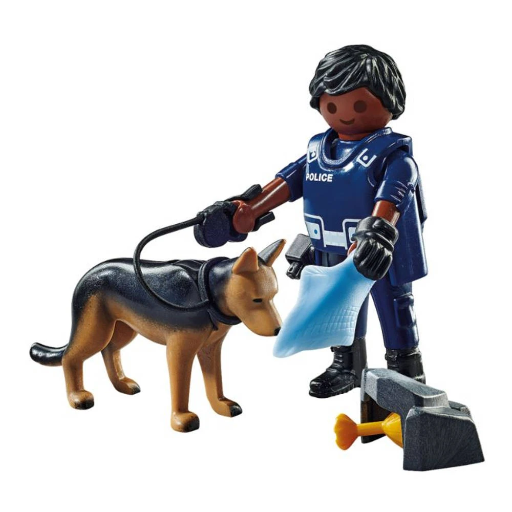 - Deze set bevat een Playmobil figuur, een speurhond, handschoenen, een riem en andere extra’s.
